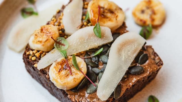 Banana bread toasté, poire, châtaigne, pollen