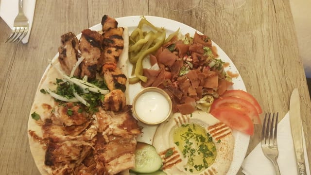 1 brochette au choix (taouk ou kefta) + 1 samboussik + fromage + frites