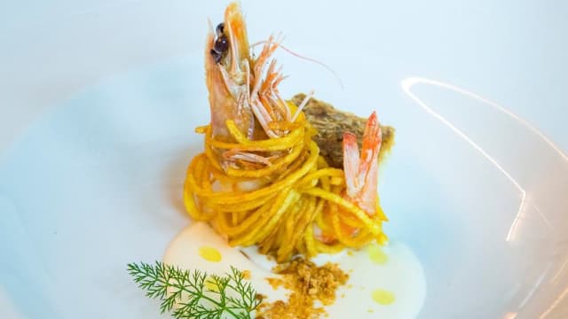 Tonnarelli cotti in acqua di pecorino, gambero rosso e lime