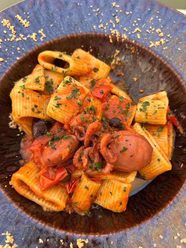 - Cous cous, polpo fritto, cime di rapa, salsa di pomodori secchi e burrata.
