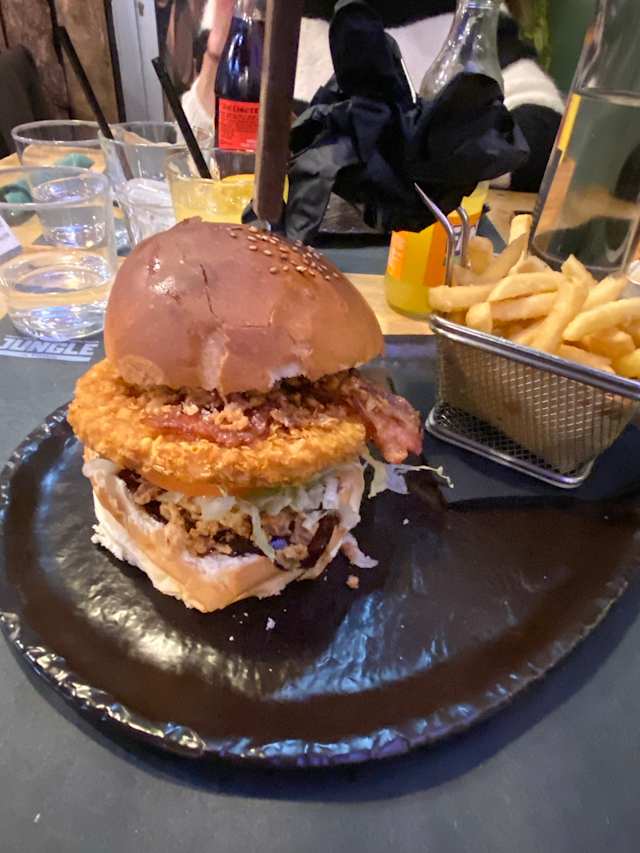 - Hamburger 220g di manzo, insalata, pomodoro, cipolla fritta, bacon, cheddar, jalapenos, salsa habanero, ketchup, maionese