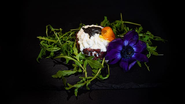 I nostri tonnarelli con crema di cavolo viola, battuta di manzo