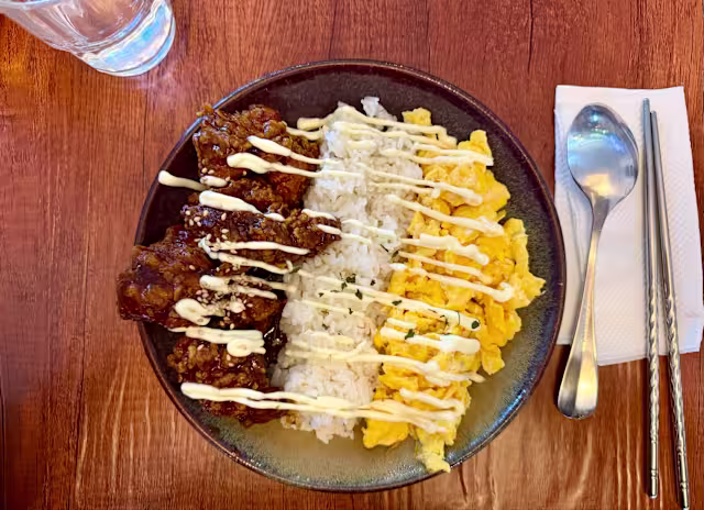 - Prato de arroz, com *vegetais, ovo estrelado, Carne ou Tofu com pasta de malagueta ou molho de soja a parte.
