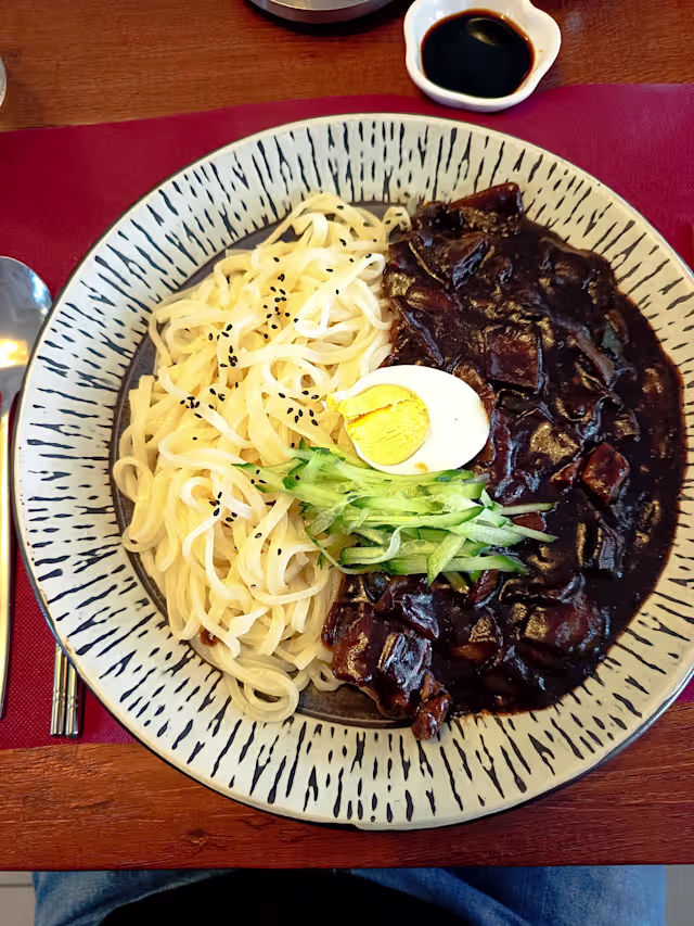 - Massa Coreana, com molho JJAJANG (Pasta de feijao, cebola e carne de porco), com courgette e ovo cozido.