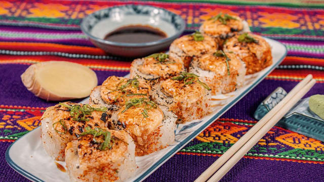 Délicieux sushi maki végétarien. Riz à sushi harmonieusement vinaigré, avec en son coeur de délicieux légumes de saison cuisiniés, le tout surplombé de notre onctueuse sauce acevichada. 10 pièces.