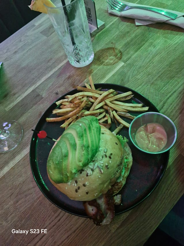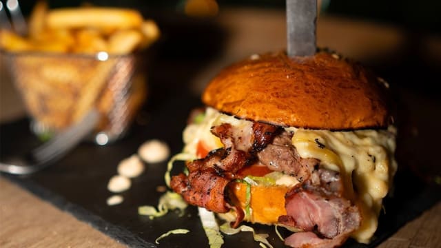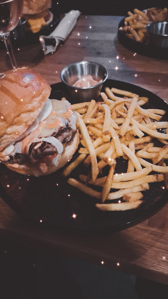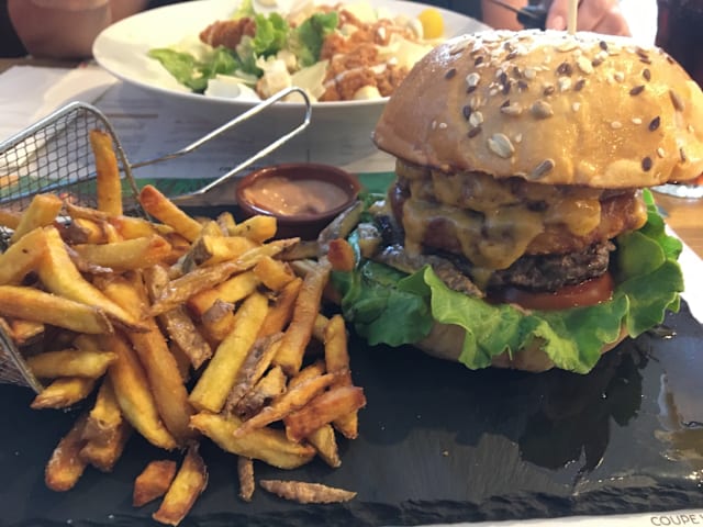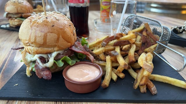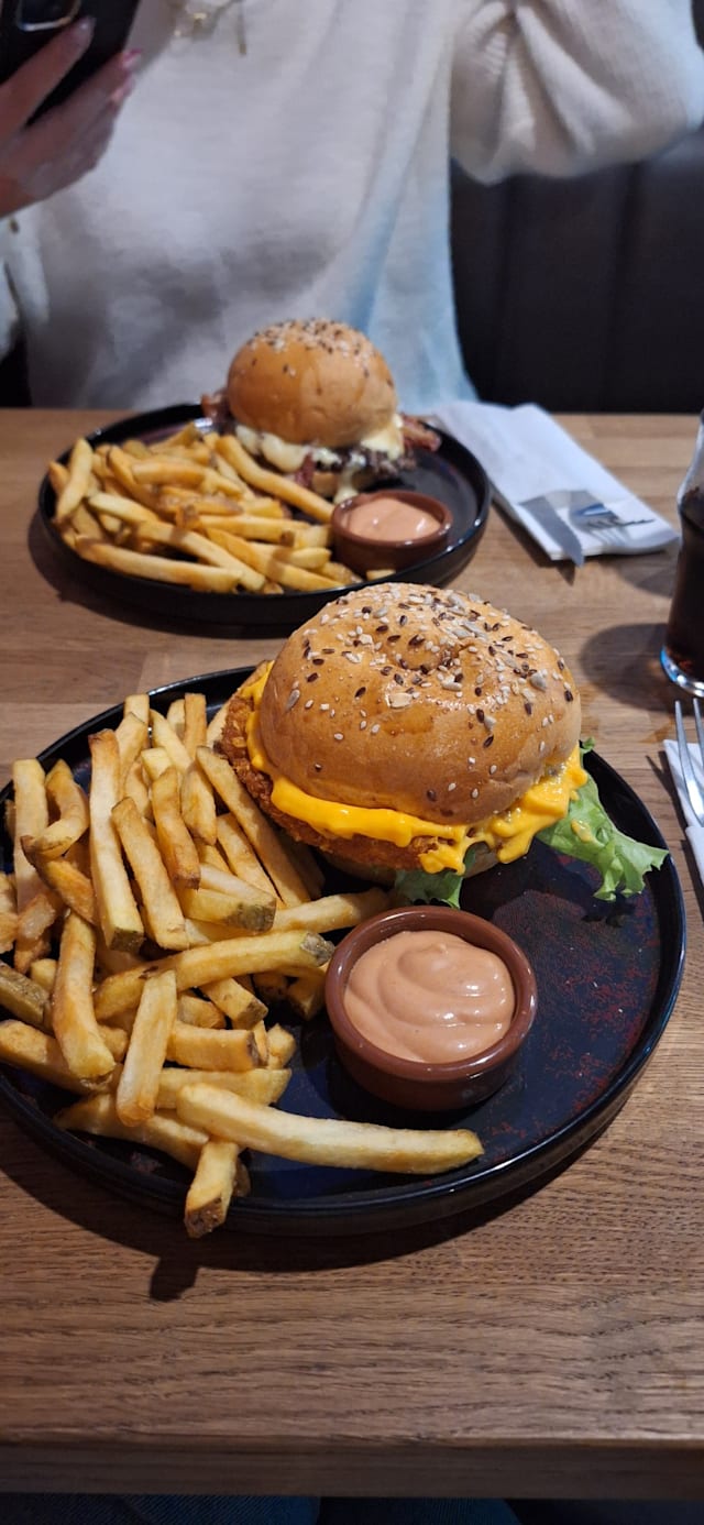 terre, 2 sauces cheddar maison, batavia, tomates, cornichons, sauce cockta