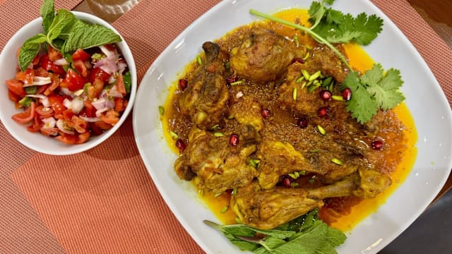 Morceaux de poulet fermier sautés dans le karahi, sauce tomate légère au yaourt, gingembre frais et cardamome, coriandre & piment vert