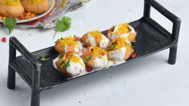 boondi, yogurt, sweet tamarind sauce, green chilli sauce, garnished with