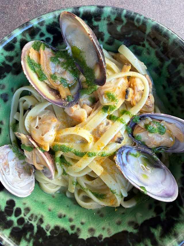 - Linguine mancini, vongole veraci, bottarga di tonno, olio al prezzemolo.
