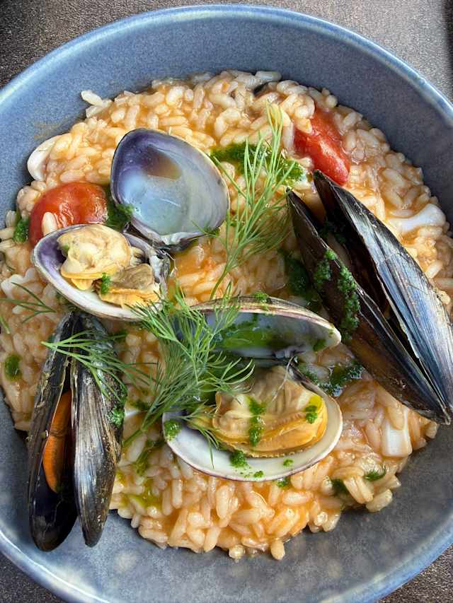 - Risotto carnaroli acquerello, calamari, vongole, cozze, pomodorini confit, olio al prezzemolo, aneto.