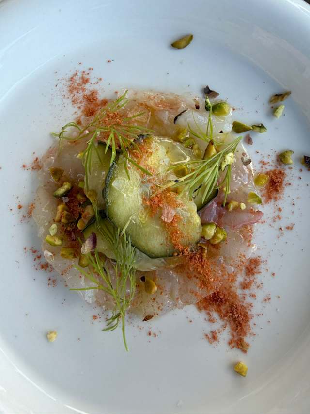 - Tonno, purea di avocado ed erbe, cialda croccante al finocchio, polvere di olive taggiasche.