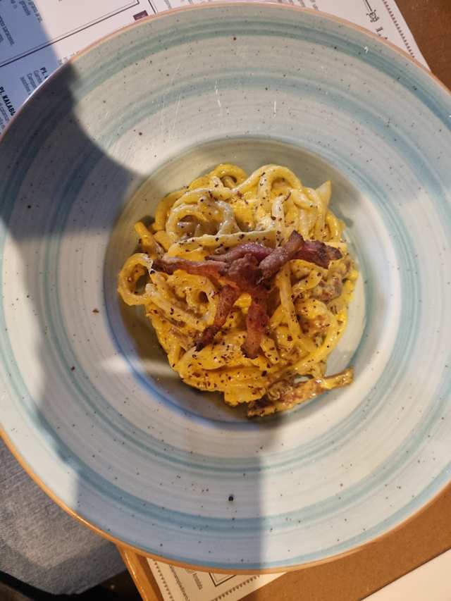 - Spaghettone con calamari, guanciale, uovo, parmigiano reggiano DOP