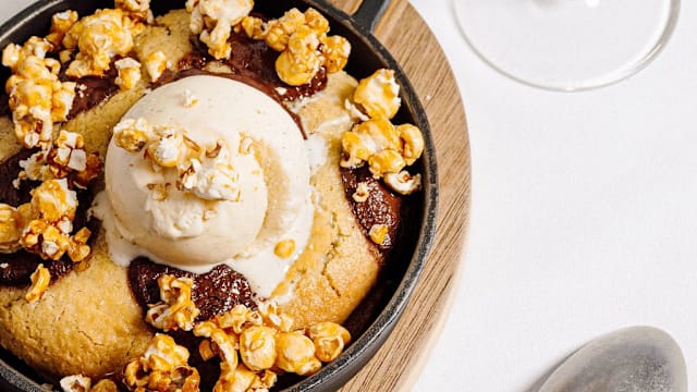 - Cookie mi-cuit au cœur coulant chocolat, noisettes caramélisées, glace vanille, popcorn au caramel salé