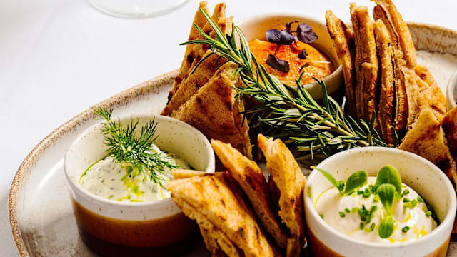 - Tarama, tzatziki, poivrons rouges marinés, houmous, pain pita