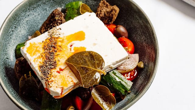 - Tomates mixtes, concombres, oignons, poivrons, câpres, olives, feta, huile de paprika fumée