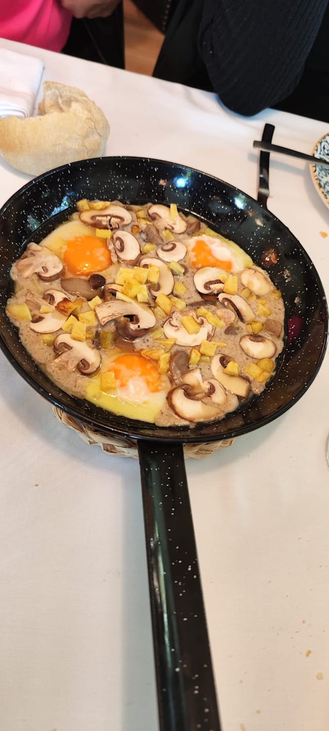 - Sartén de huevos con crema de boletus, hongos y patatitas