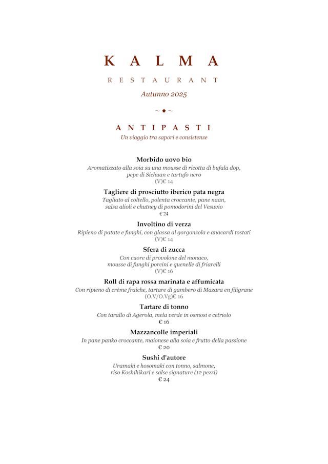 10/10We were in Pompei for my husband's birthday so we wanted something special. We went to Kalma as it had the best reviews. When you enter the restaurant it is like entering a completely different world (in a good way). The decor, the staff, the service, and of course the food were all just perfect! I would like to expressly mention that the manager was exceptionally attentive (it's been a while since we were looked after so well :)) We loved our evening at Kalma. It truly is an exceptionally good restaurant and I would highly recommend it.