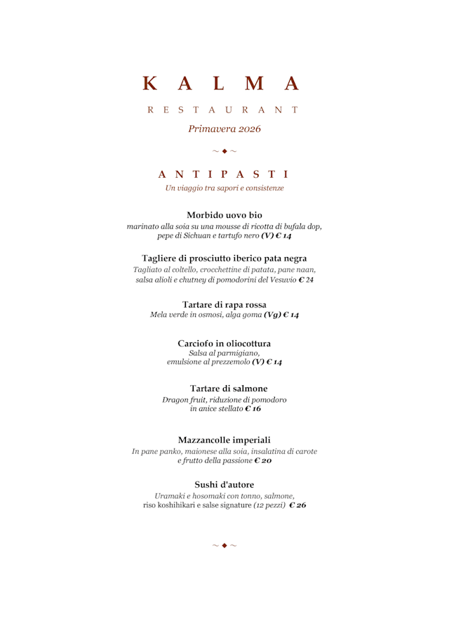 10/10+1The ambience is serene, calm, clean & welcoming. The welcome by everyone was perfect and set the tone; PERFECTION IN EVERY DETAIL. I didn’t expect a comprehensive a la carte but because we couldn’t choose we both had the tasting menu. The food and service were stunning, accompanied by a gorgeous local wine. Even the dishes and plates showed off the food to delight the senses before reaching the lips. Honestly the best meal I have ever had (& I have had many). Compliments to the chef too. I wish I could have met her to shake her hand. Next time I will. There will definitely be. Next time. Thanks Kalma. You are the gem of Campania.