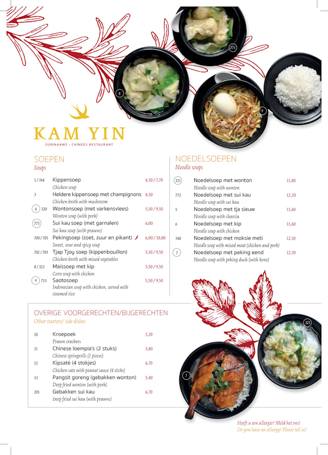 Chinees en Surinaams restaurant Kam Yin is in 1980 begonnen als eethuisje aan de destijds roerige kop van de Zeedijk in Amsterdam. Dit is voor de meeste mensen wel een bekende locatie. Als Surinaams Chinees restaurant, ofwel Surinees, zijn wij inmiddels een begrip in Amsterdam en omstreken, dankzij ...