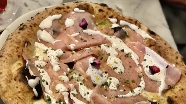 Provola affumicata, mortadella di bologna IGP, pistacchio di bronte, crema di ricotta fresca vaccina, olio “EVO”, basilico.