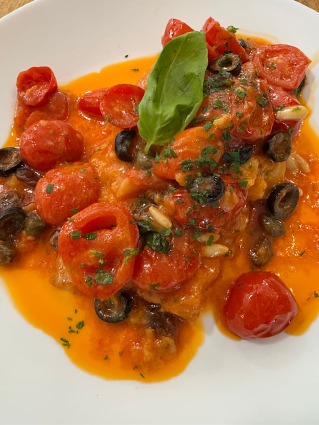 Fagottini di alici fritte con salsa di pomodori secchi e pistacchio