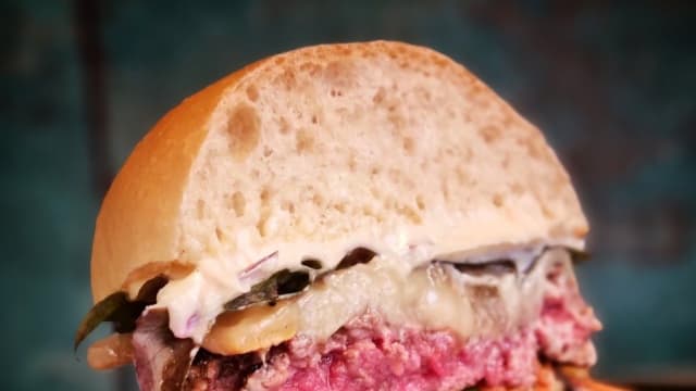 - Haché de boeuf des hauts-de-france, fondu de saint paulin fermier (goût entre le gruyère et la raclette), pickles de légumes de saison maison, oignons rouges, mayonnaise maison, pain faluche artisanal.