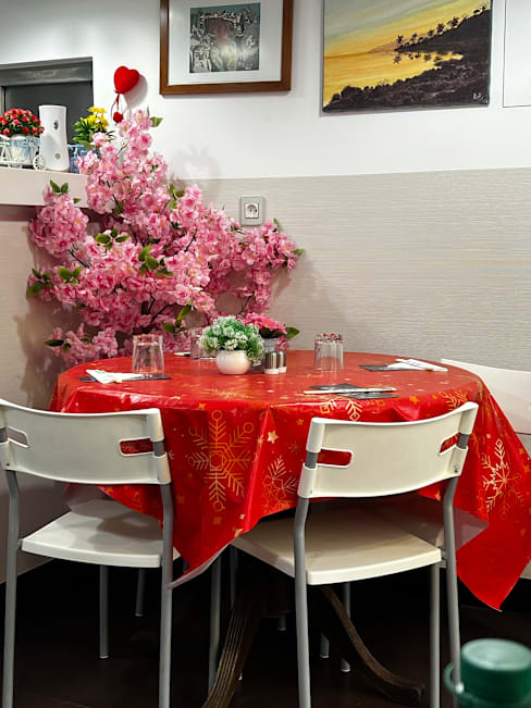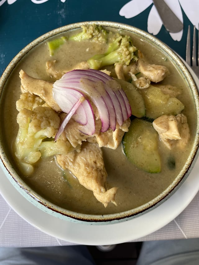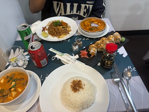 6/10The food had some Thai flavor, but was not authentic Thai style. The curry was a bit too thick. The small space had no music or any ambience, but luckily we were the only customers, so it was not awkward to share with someone else. Decoration is random (such as Christmas table clothes in May) and it took a while for the food to arrive. They do not serve alcohol, which would be a nice plus to the spicy food experience.