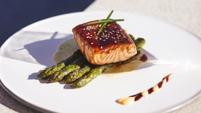 Salmone alla piastra con salsa teriyaki e verdura di stagione