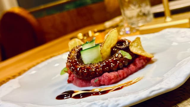 Polpo piastrato con salsa teriyaki con letto di purea e chips di patate