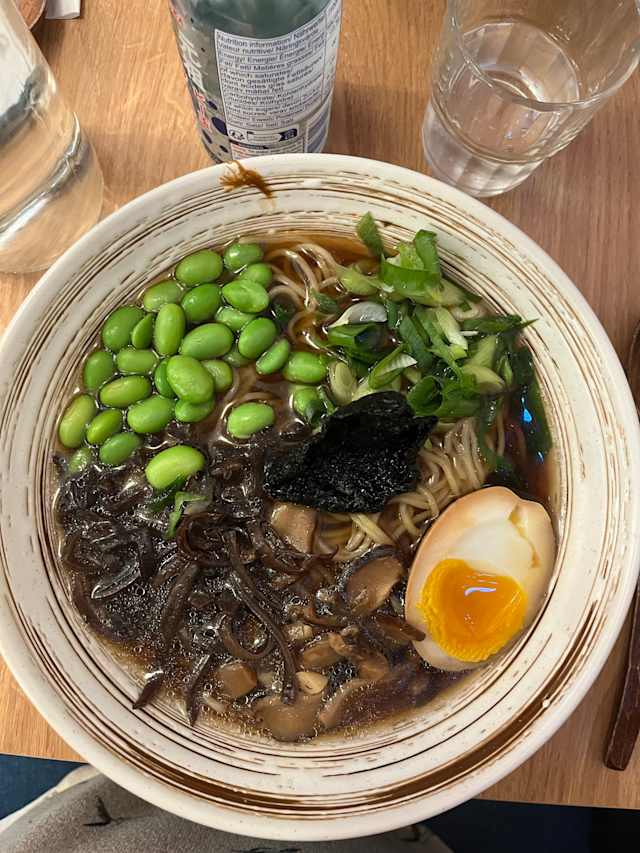 - Bouillon shoyu mélange de 3 sauces soja japonaise, shiitakés sautés, edamames, kikuages sautés, demi œuf nitamago, 1 chips de nori, cebette