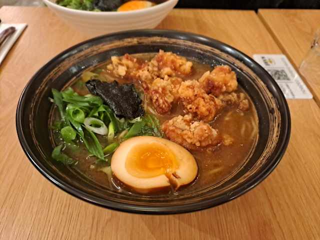 - Bouillon de miso blanc, 5 piéces de karaage, demi œuf nitamago, 1 chips de nori, cebette