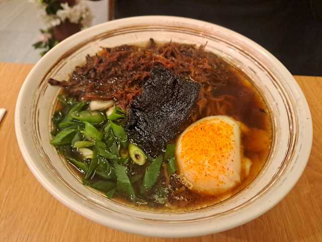 - Bouillon shoyu mélange de 3 sauces soja japonaise, bæuf effiloché, onsen tamago au shichimi (mix de 7 épices japonaises), chips nori et cebette