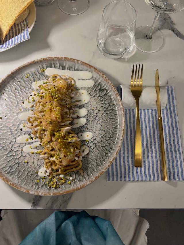 Tonnarelli al datterino giallo, burrata, tartare di gamberi e pistacchio