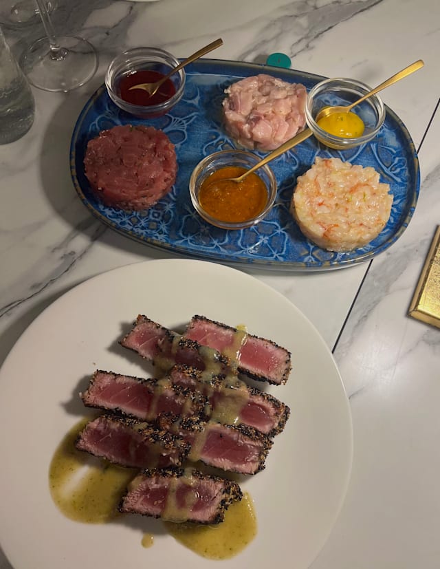 Tonno scottato in crosta di sesamo, salsa di pesche e basilico