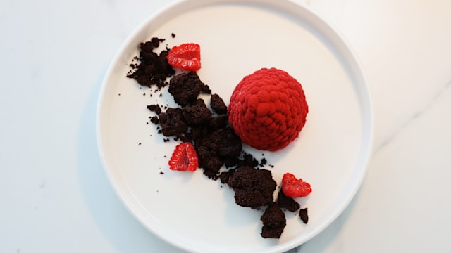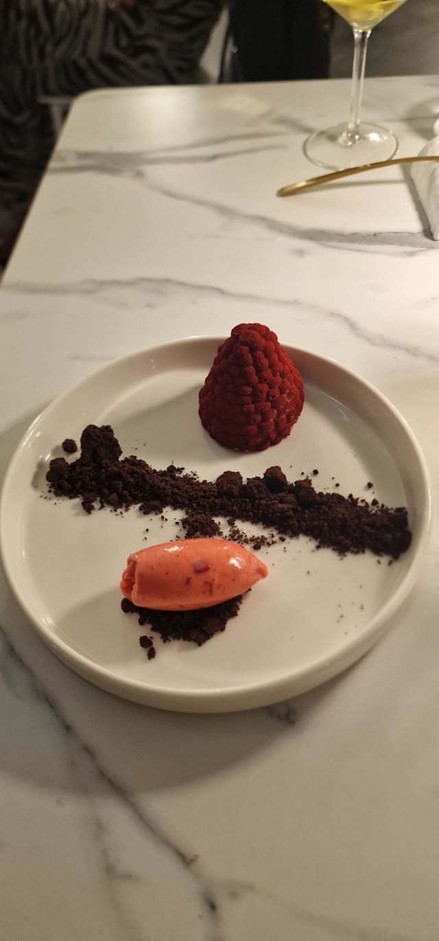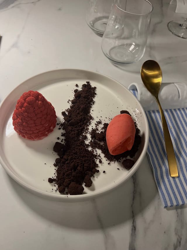 Mousse al lampone e vaniglia, crumble al cioccolato e gelato al lampone