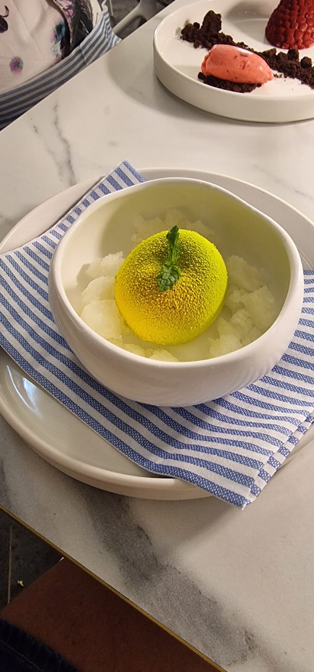 Semifreddo mela verde, cuore di limone e zenzero e granita al gintonic
