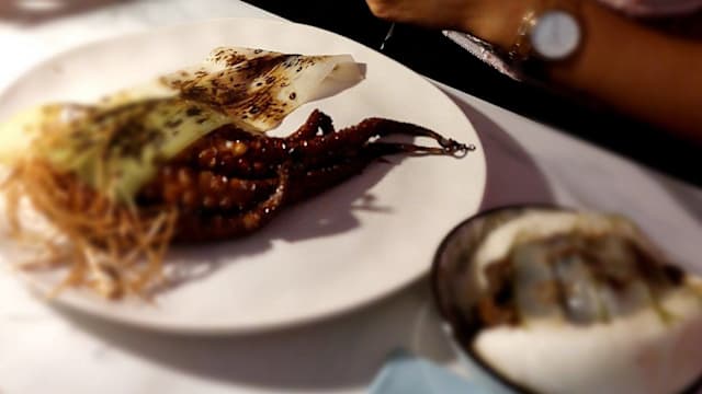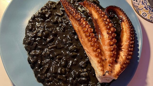 Calamaro ripieno al nero di seppia, crema di edamame e cipolla caramellata