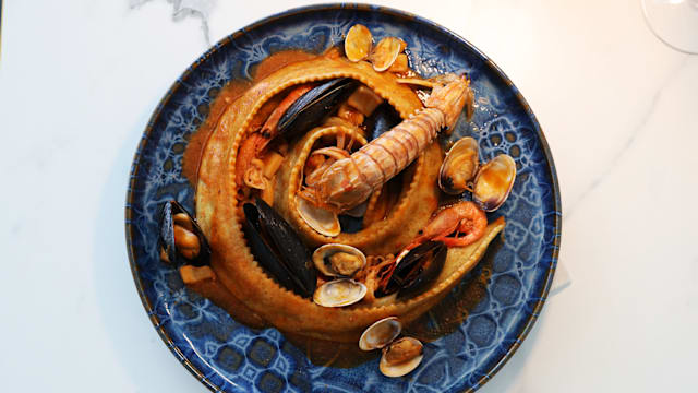 Patata fumé, polpo scottato e spuma di patate alla paprika