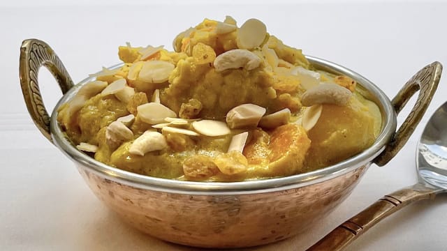 - Poulet prépare dans une sauce à base de crème fraîche avec des amandes, des noix de cajou et des raisins secs
