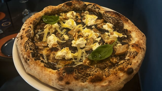 Mozzarella di bufala da 125 gr, crema di funghi porcini, cipolletta fresca, funghi porcini, scaglie di grana in uscita, basilico, olio.