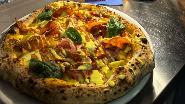 Crema di zucca, bocconcino di mozzarella da 125 gr, speck, gorgonzola, scaglie di grana, olio.