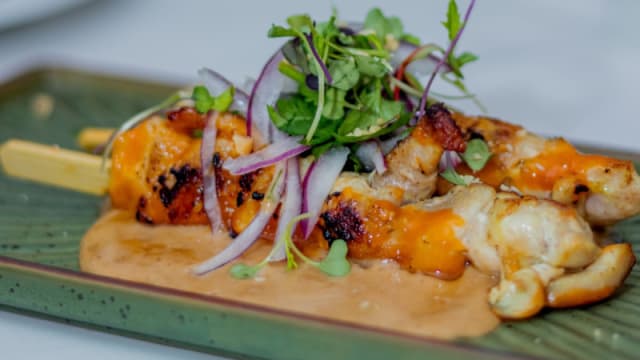 Estilo satay con salsa de cacahuete, cebolla y cilantro