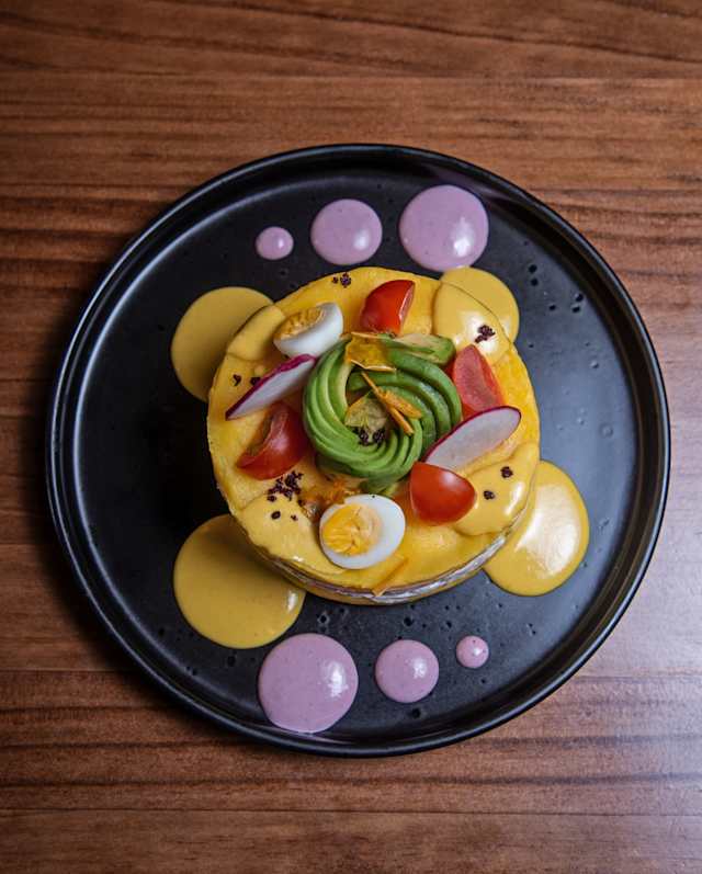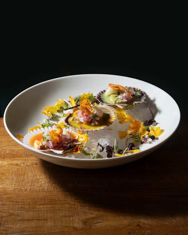 - Pescado fresco marinado en lima, ají, cilantro, con cancha, choclo y boniato