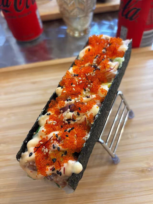 - Fresco salmão e atum, abacate, manga e tobiko (ovas de peixe voador), maionese japonesa ou maionese picante, alface de cordeiro, mistura de gergelim, ito togarashi (filamentos de pimenta)