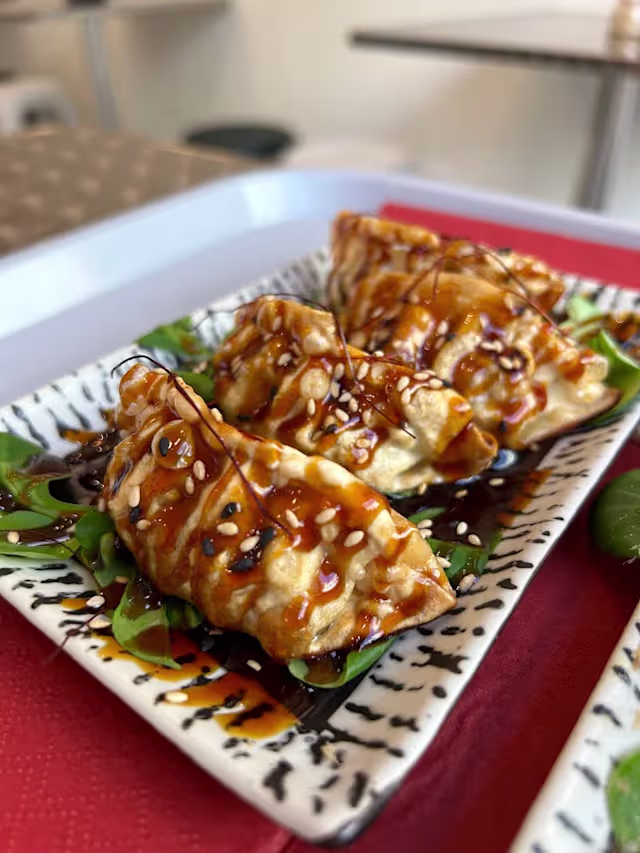 - bolinhos japoneses fritos recheados com legumes e massa de frango colorida com cúrcuma. Servido com molho tonkatsu, mistura de gergelim, filamentos de pimenta e cebolinha