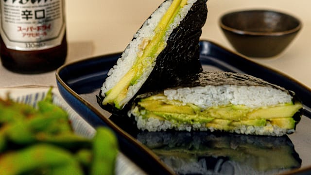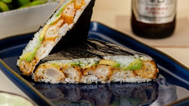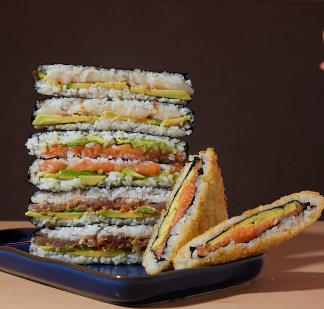 Pez mantequilla, cebolla frita, y aguacate. Sandwiches de sushi, con exterior de alga nori y arroz. ¡relleno de tus toppings favoritos