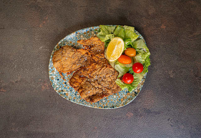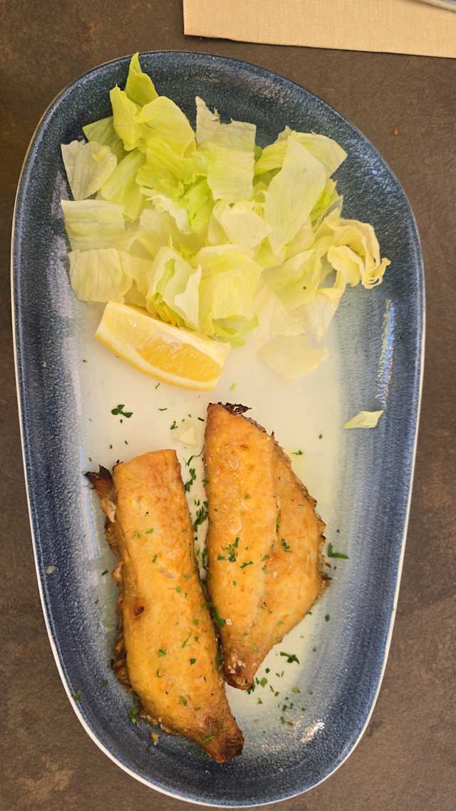 - Taglio di pesce frollato alla griglia servito con nido di scarola ripassata con pinoli tostati
