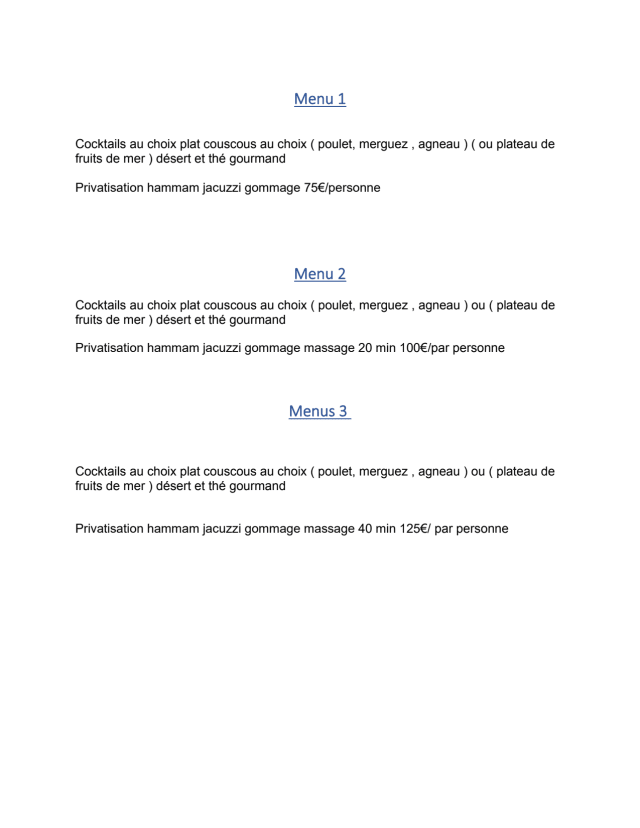 Cocktails au choix plat couscous au choix ( poulet, merguez , agneau ) ou ( plateau de fruits de mer ) désert et thé gourmand