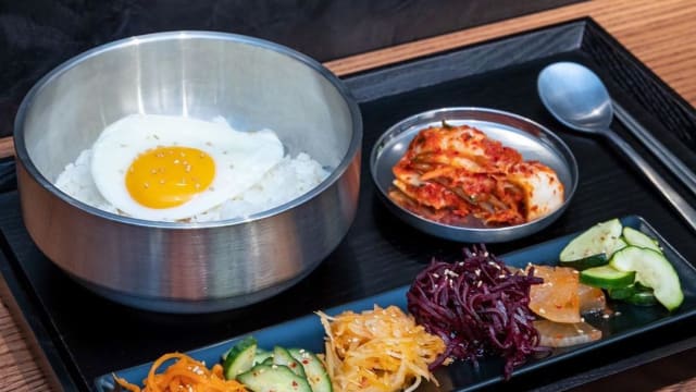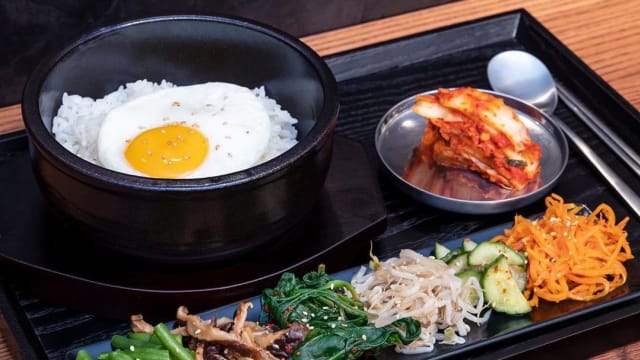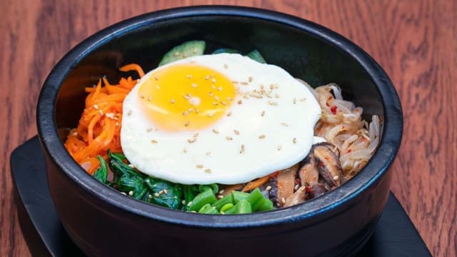 Raw-fish Bibimbap is a popular Korean dish consisting of steamed rice mixed with different fresh vegetables. You can of course choose any other of the available proteins.