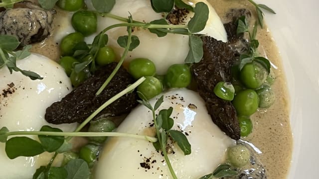 Ris de Veau "Française" poêlé, asperges violettes d'Albenga, jus de veau aux morilles
